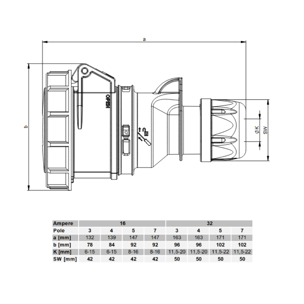 Rallonge triphasée CEE 32A IP67, paramètres techniques :