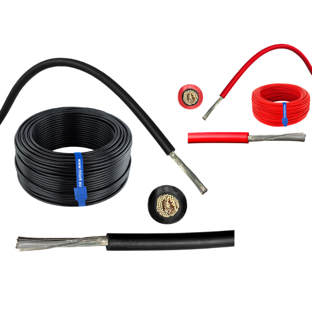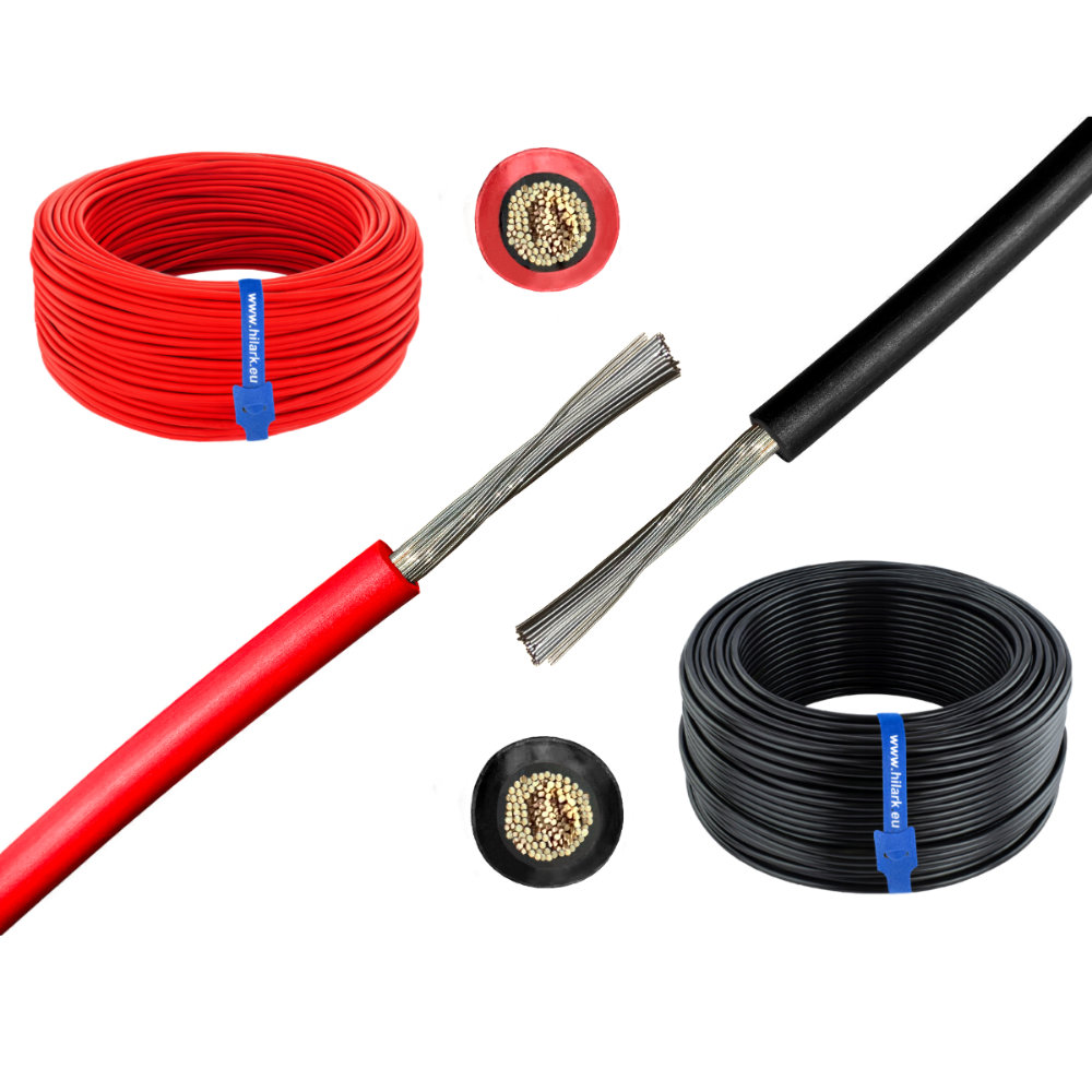 Câbles solaires, photovoltaïques souples de très haute qualité, monoconducteurs destinés aux installations photovoltaïques, avec un conducteur en cuivre multibrins torsadé, avec isolation et gaine en matériau réticulé sans halogène ; ils se distinguent par une grande résistance mécanique et une résistance aux effets néfastes des rayonnements UV ainsi qu’aux conditions atmosphériques.