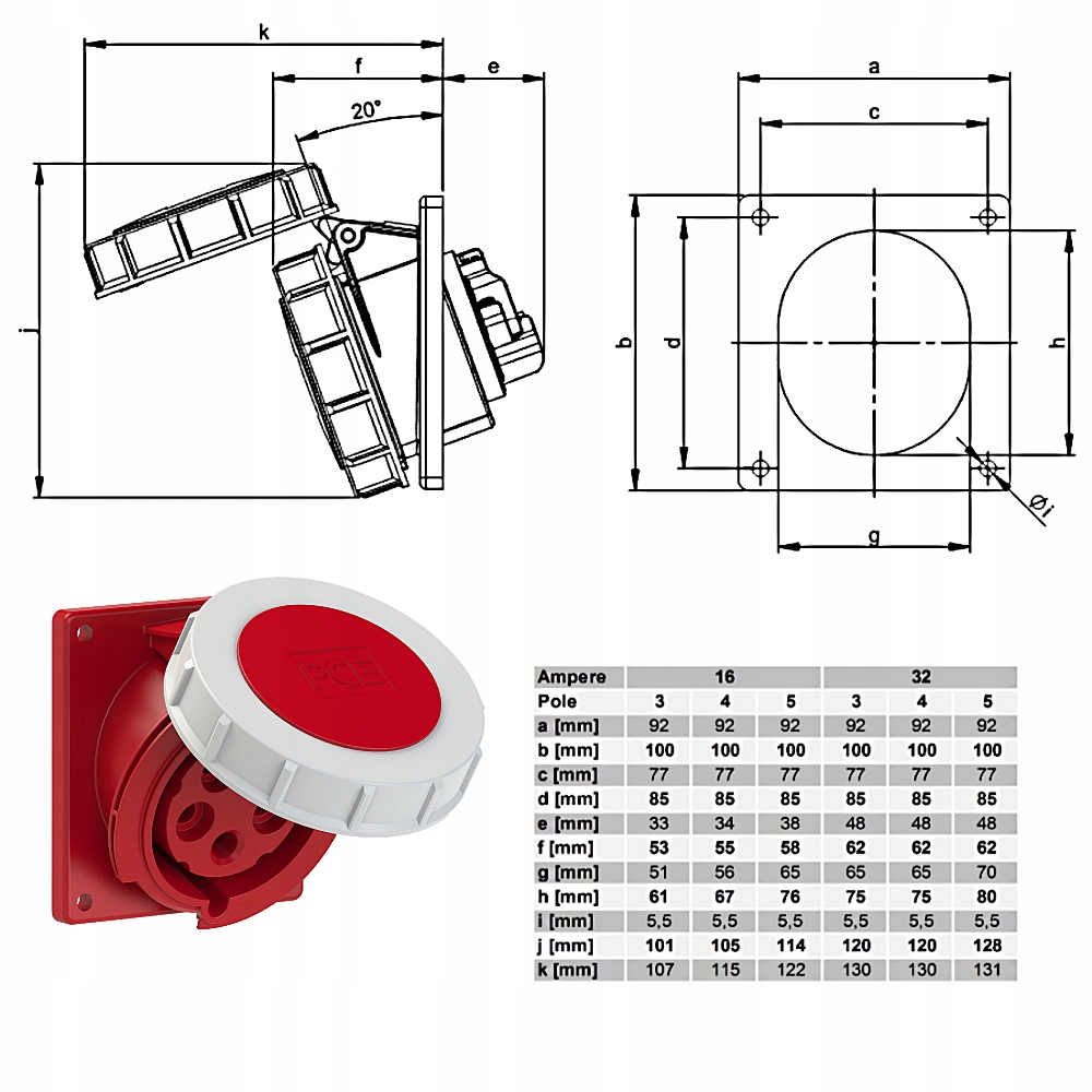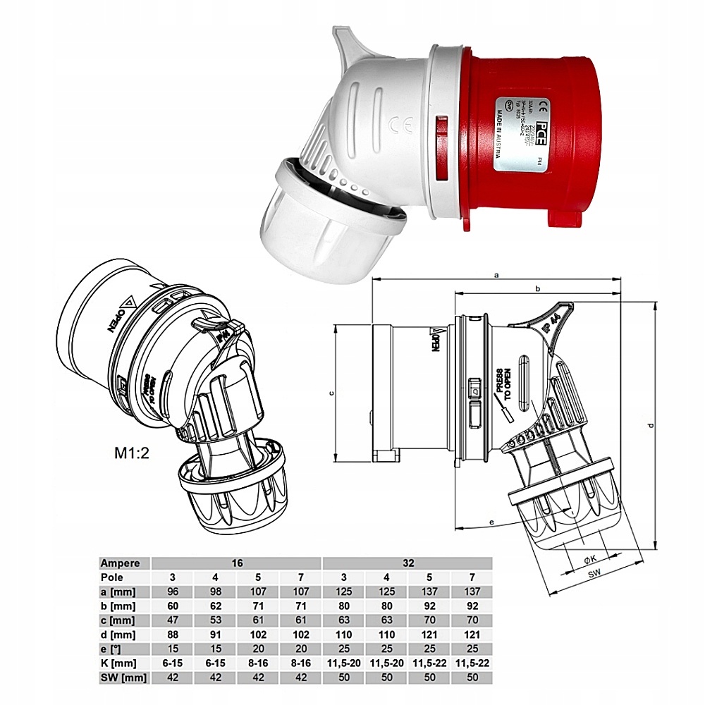 • 2 prises obliques PCE 4252-6 5 broches 32A 400V IP44 / IP67