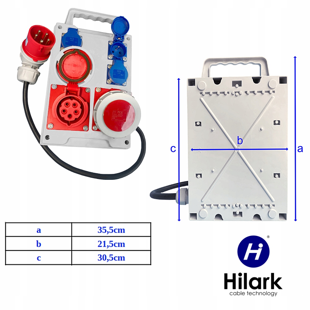 Coffret de chantier portable 2 prises triphasées 32A IP67, 4 prises monophasées, avec câble de raccordement H07RN-F 5×6 terminé par une fiche coudée 32A entièrement connecté env.35m