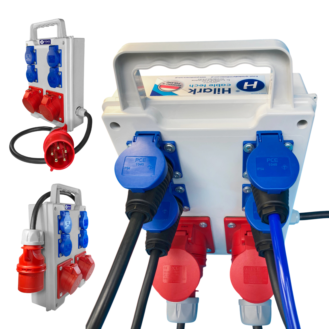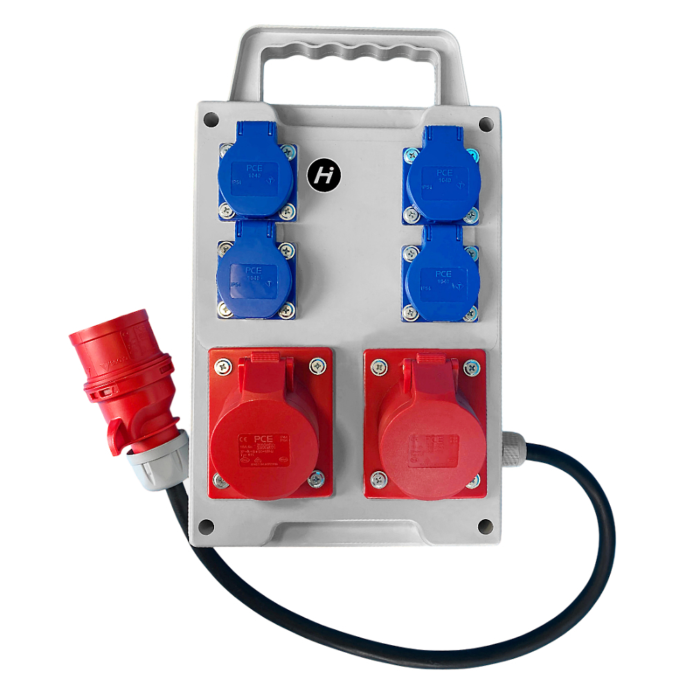 Coffret de chantier portable équipé de prises de la marque reconnue PCE avec prises industrielles : 1x32A+1x16A+ 4x230V sur H07RN-F 5×4 terminé par une fiche 32A