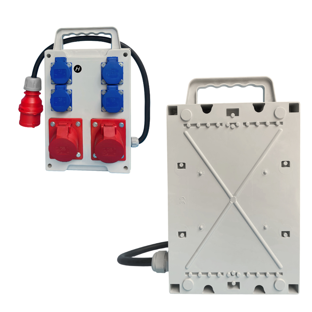 Coffret de chantier portable basé sur des prises de la marque reconnue PCE avec prises industrielles : 1x32A+1x16A+ 4x230V sur H07RN-F 5×4 terminé par une fiche 32A