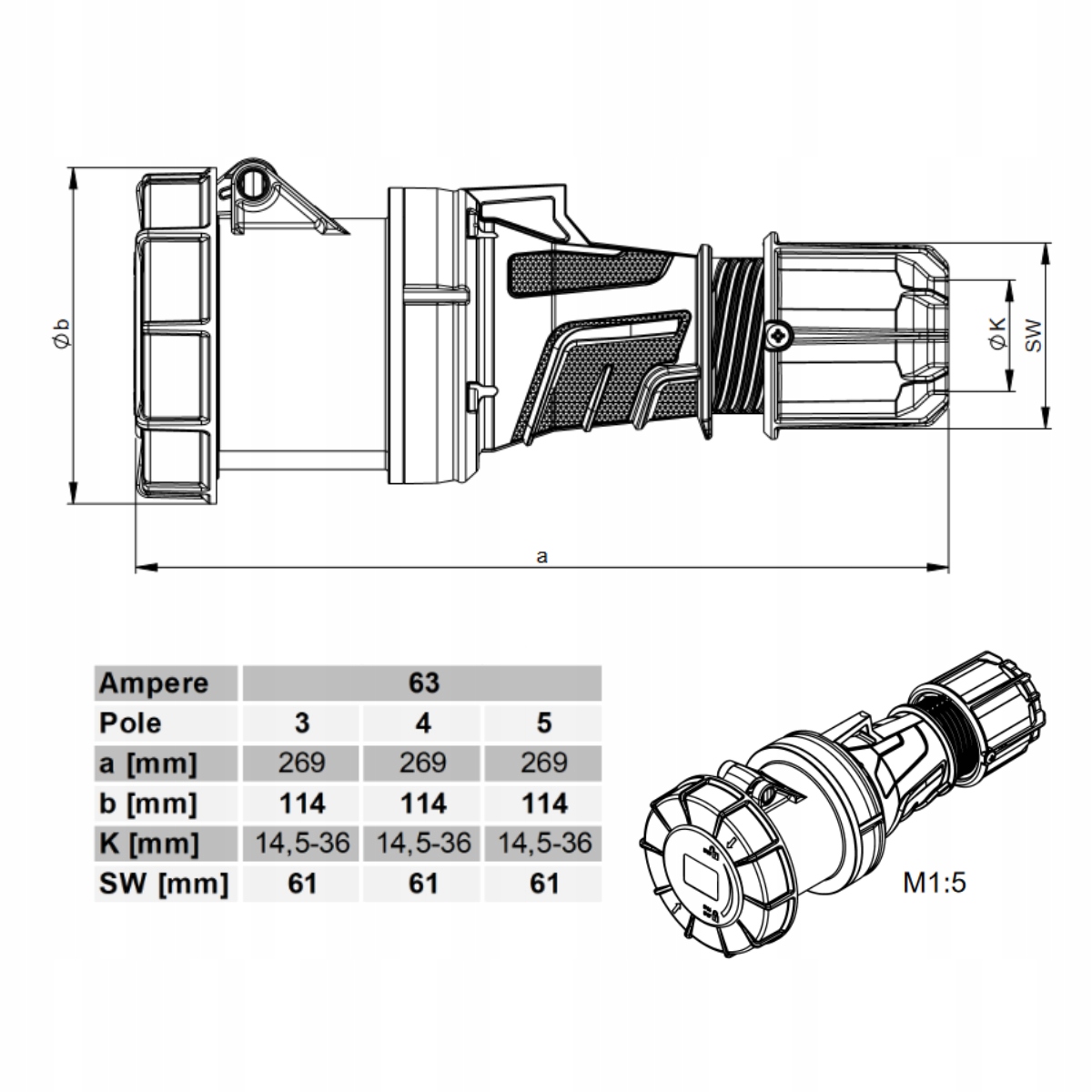 Prise mobile triphasée – c’est un élément indispensable de l’installation électrique triphasée. La conception spéciale et l’utilisation de matériaux de haute qualité rendent la prise résistante aux dommages mécaniques ; le haut indice de protection IP67 garantit la résistance de la prise à la poussière et aux projections d’eau, et le couvercle vissé étanche offre une protection supplémentaire contre la poussière et l’humidité. Les contacts en laiton assurent quant à eux la sécurité et la fiabilité lors de l’utilisation. Indispensable pour le raccordement d’appareils nécessitant une forte demande électrique, tels que générateurs, moteurs ou autres équipements industriels et de chantier.