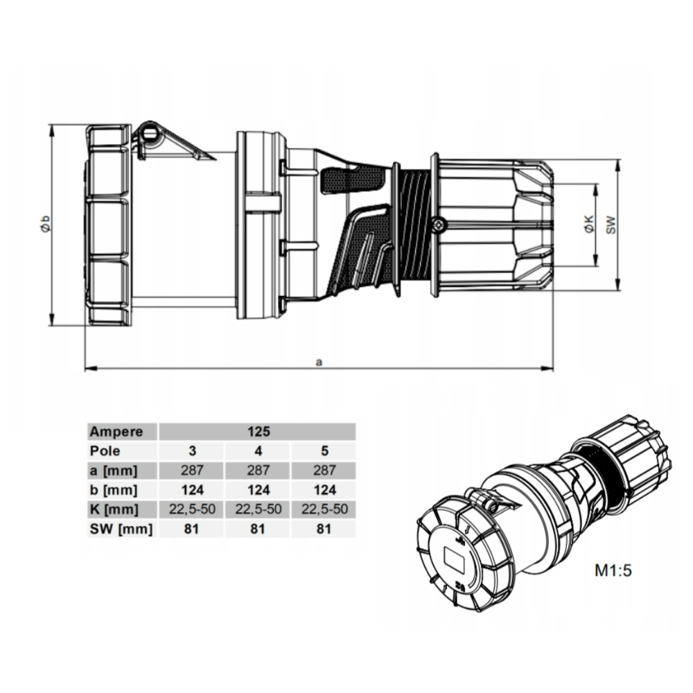 - Idéal pour les câbles 5 conducteurs. Courant nominal 125A