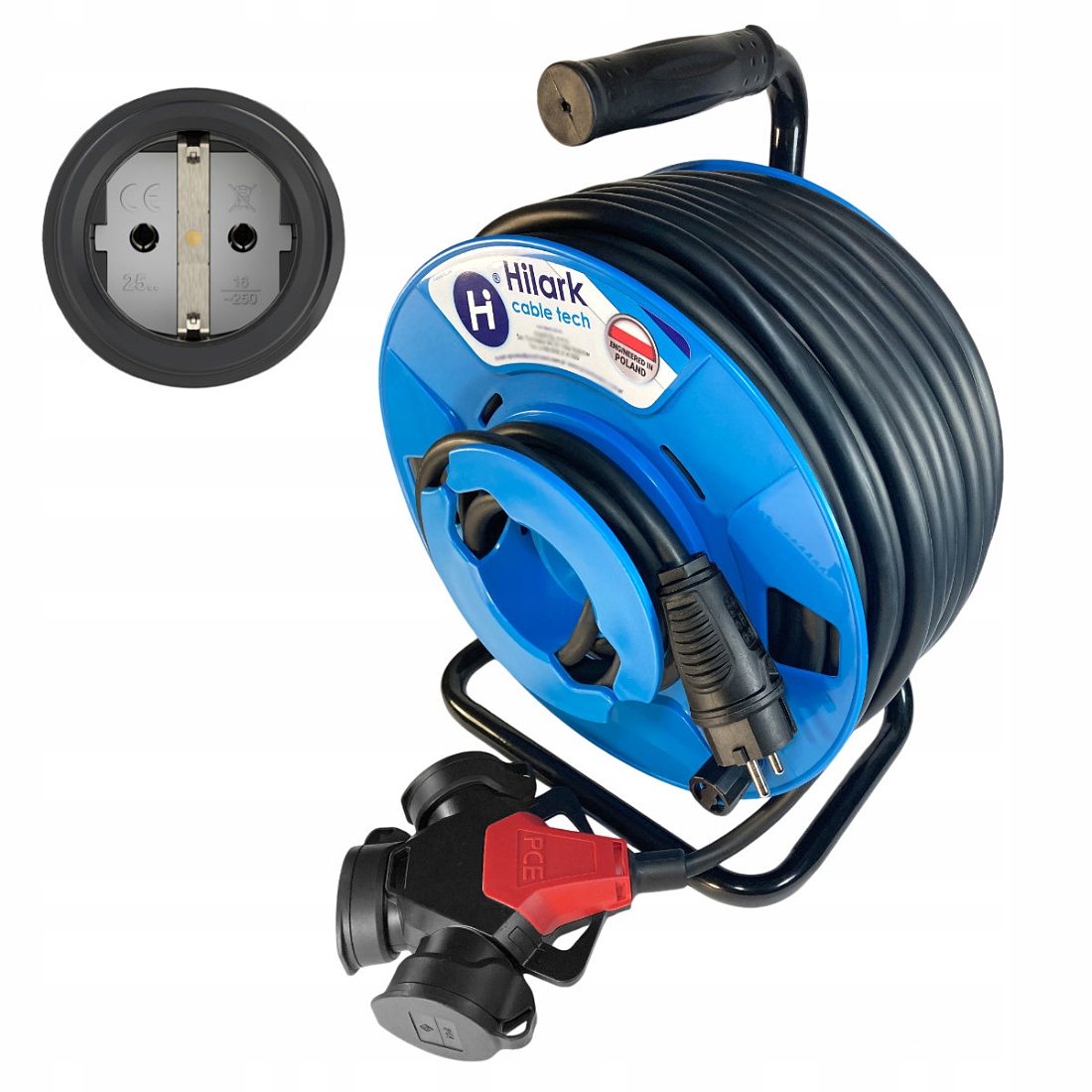 ZASTOSOWANIE: Dzięki użyciu kabla neoprenowego H07RN-F oraz wysokiej jakości rozgałęźnika i wtyczki PCE o stopniu ochrony IP54, przedłużacza można bezpiecznie używać w miejscach gdzie jest narażony na oleje czy smary, w trudnych warunkach atmosferycznych, w suchych i wilgotnych miejscach zarówno wewnątrz jak i na zewnątrz pomieszczeń. Bęben z ergonomiczną rączką i stabilną metalową konstrukcją pozwala na wygodne przenoszenie przedłużacza w dowolne miejsce. Ruchoma korbka pozwala na szybkie i wygodne nawinięcie kalba przedłużacza na bęben, a hamulec zapobiega niepożądanemu rozwijaniu się kabla z bębna. Doskonale sprawdzi się do oświetlenia alarmowego, narzędzi elektrycznych takich jak wiertarki, piły tarczowe, silniki elektryczne, spawarki, myjki ciśnieniowe; do prac budowlanych i remontowych, warsztatu, kopalń, kuchni, płyt grzewczych. Jak również do innych zastosowań w przemyśle, w gospodarstwach rolniczych, do bezpiecznego zasilania różnego rodzaju imprez (do sprzętu scenicznego i audiowizualnego). Rozgałęźnik pozwala na jednoczesne podłączenie 3 urządzeń zapewniając bezpieczną pracę.