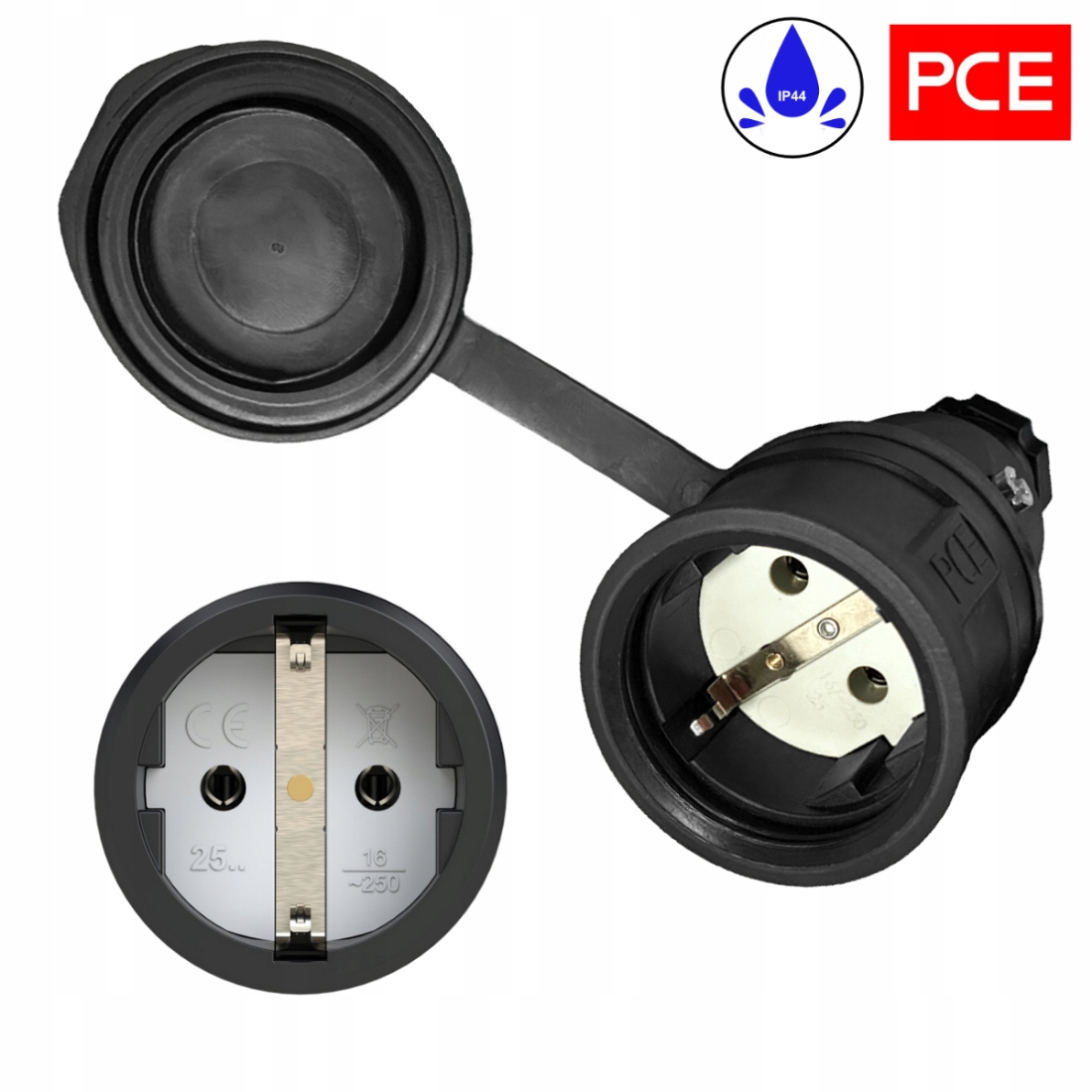 - gniazdo Schuko PCE IP54 ochrona przed pyłem i zachlapaniem, z kalpką ochronną