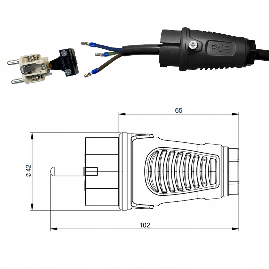 - Solidna, skręcana wtyczka PCE IP54 z ochroną przed pyłem i zachlapaniem