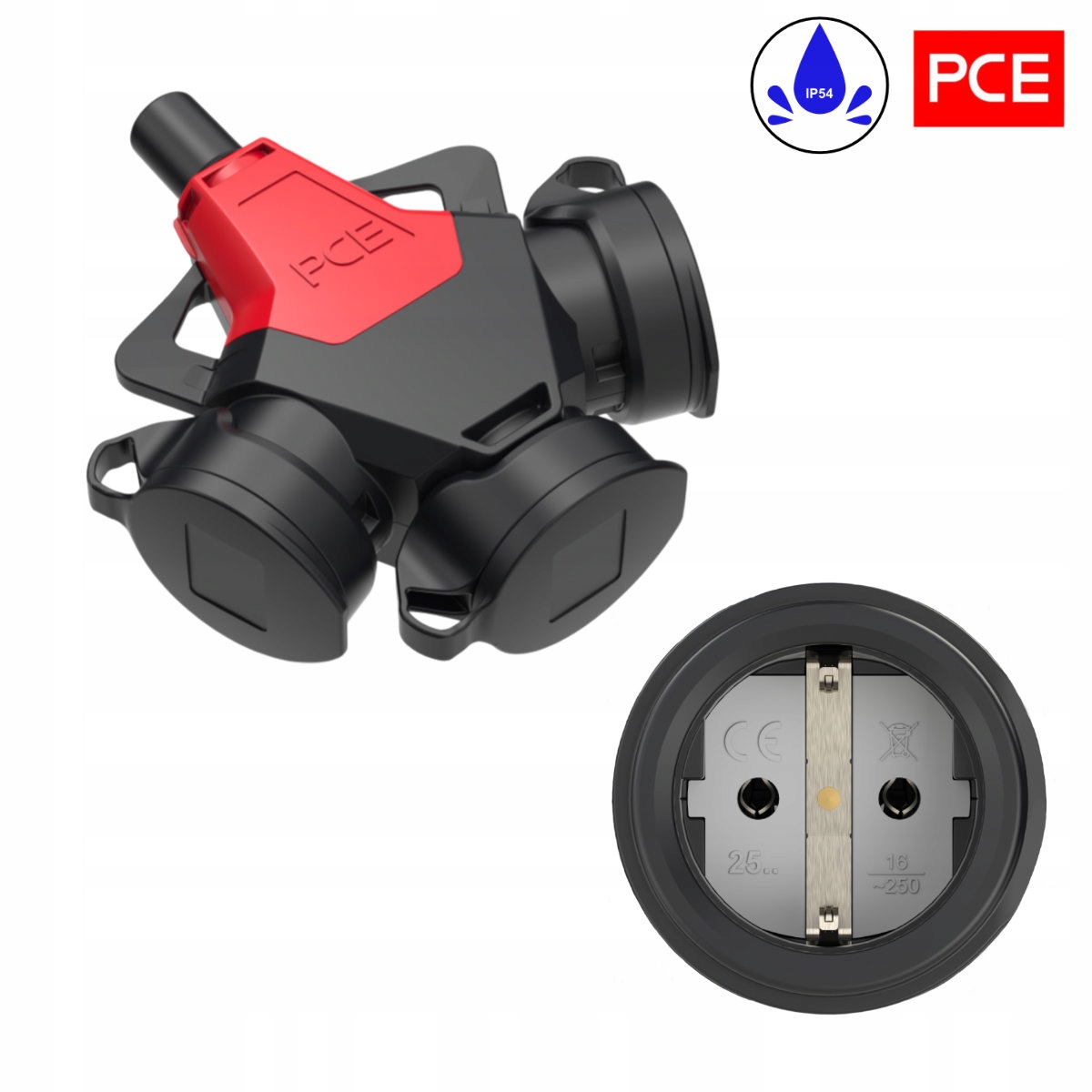 - Trójnik PCE IP54 – możliwość podłączenia 3 urządzeń jednocześnie (zachowując max. dopuszczalne obciążenie)