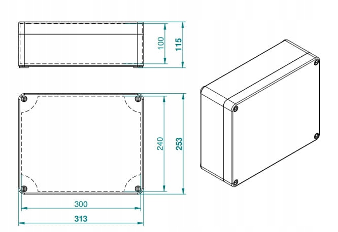 Boîtier électrique étanche aux dimensions 313x253x115 pour applications industrielles, notamment.