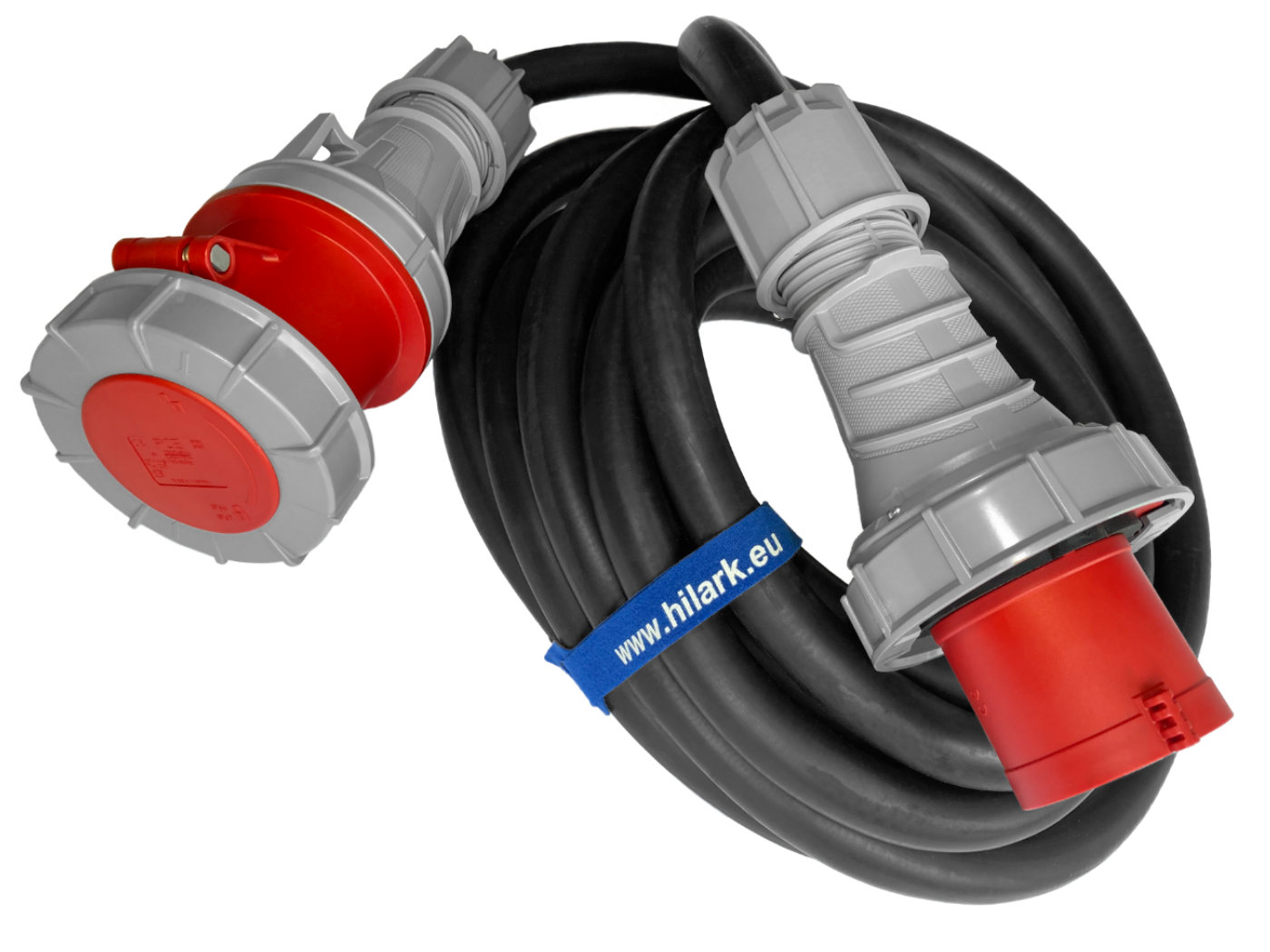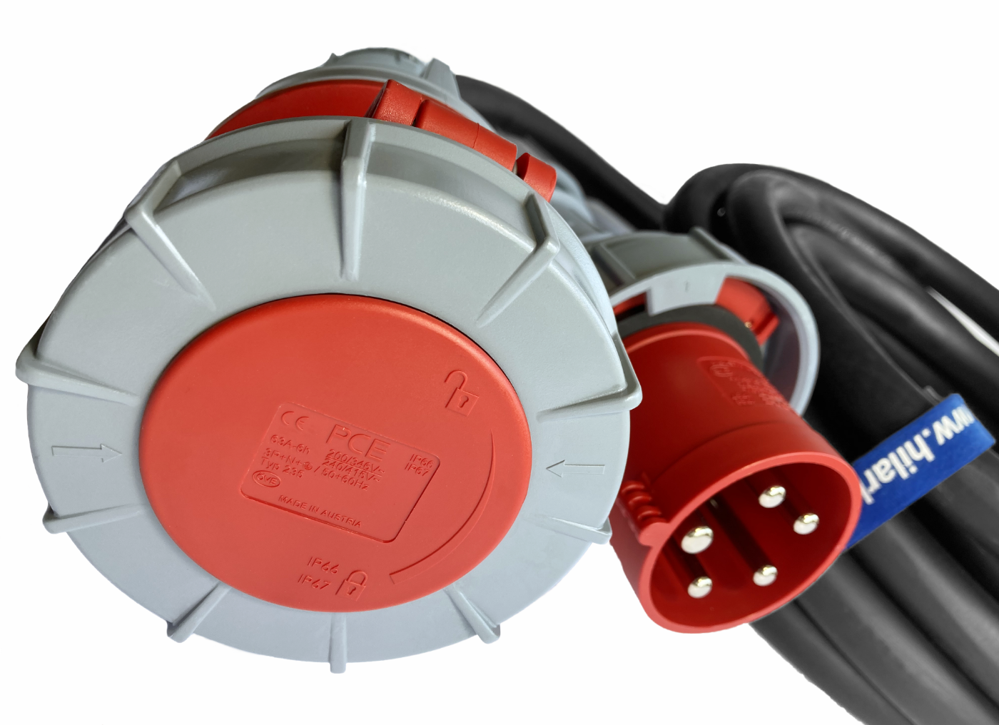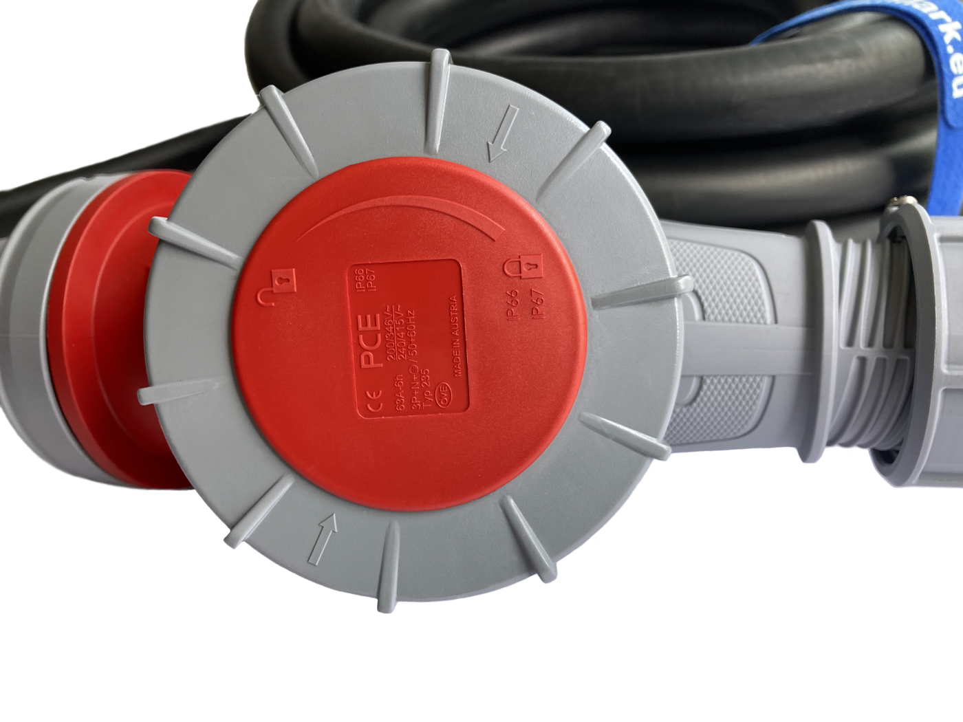 - Caoutchouc type Néoprène, indice de protection IP 44, prises de marque PCE – démontables à vis, non surmoulées, 63A