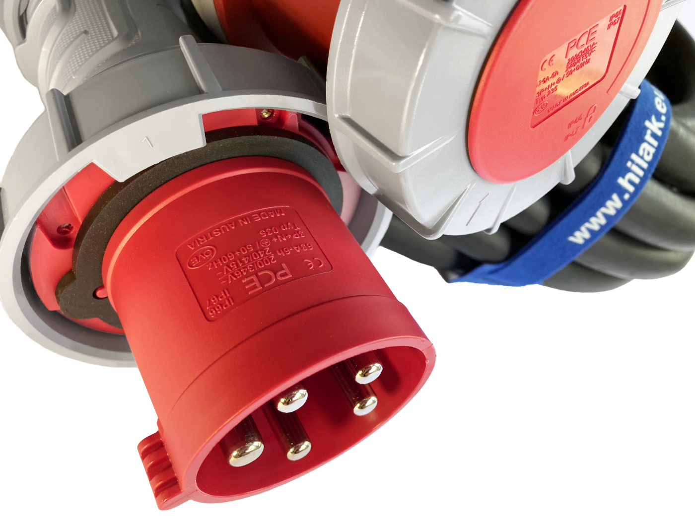 - Caoutchouc de type Néoprène, Indice de protection IP 44, prises de marque PCE – réutilisables, démontables, non surmoulées, 63A