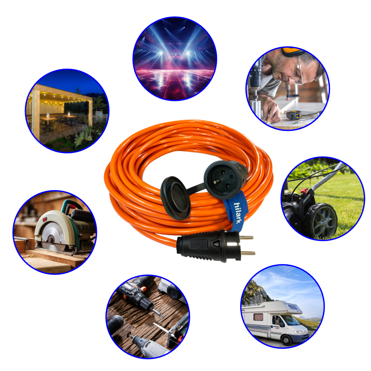 Rallonge sur câble flexible en polyuréthane orange, avec un indice de protection IP54, garantissant un fonctionnement sûr dans des endroits humides et mouillés ; idéale pour une utilisation intérieure comme extérieure ; pour les connexions de machines et d’installations dans des zones où peuvent survenir des dommages mécaniques, des contraintes, de l’humidité et des poussières. Le câble en polyuréthane est extrêmement résistant et résistant aux différents types de dommages mécaniques ; combiné à une prise et une fiche PCE de haute qualité, il permet une utilisation sûre de la rallonge dans des conditions de travail difficiles. Utilisation : pour le raccordement d’outillage électroportatif à faible consommation tels que perceuses, scies, outils d’atelier ou de garage ; convient également au jardin (pour les coupe-bordures ou les tondeuses à gazon), à l’industrie, l’agriculture, les chantiers navals, les chambres froides ainsi qu’au secteur commercial.