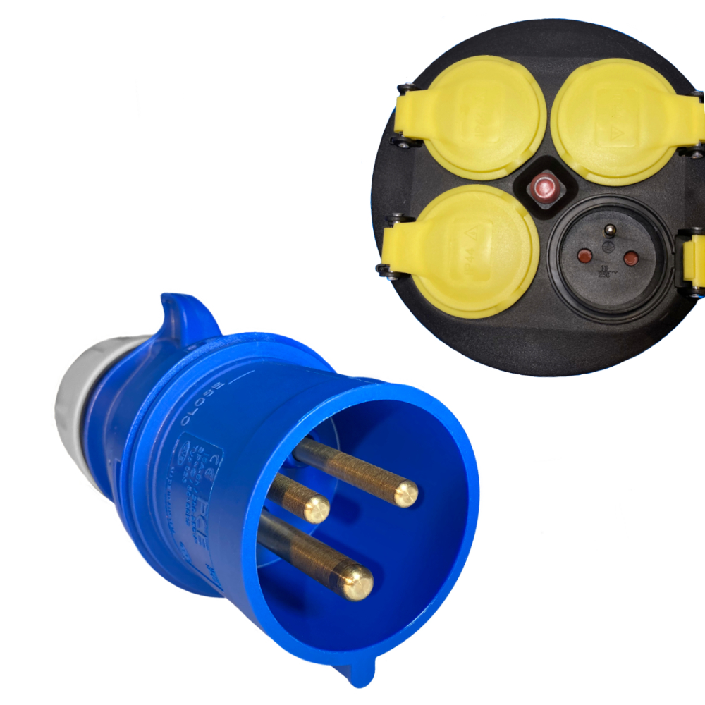 4 prises interchangeables : 4x230V 16A (Type E avec broche de terre) indice de protection IP44 (protection contre les projections d’eau)