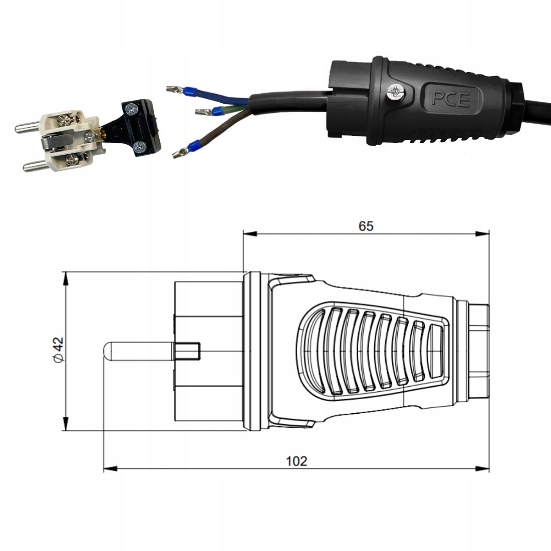 - câble très robuste H05RR-F 3×2,5 ; fiche PCE 16A code 0521-SS, avec indice de protection IP54