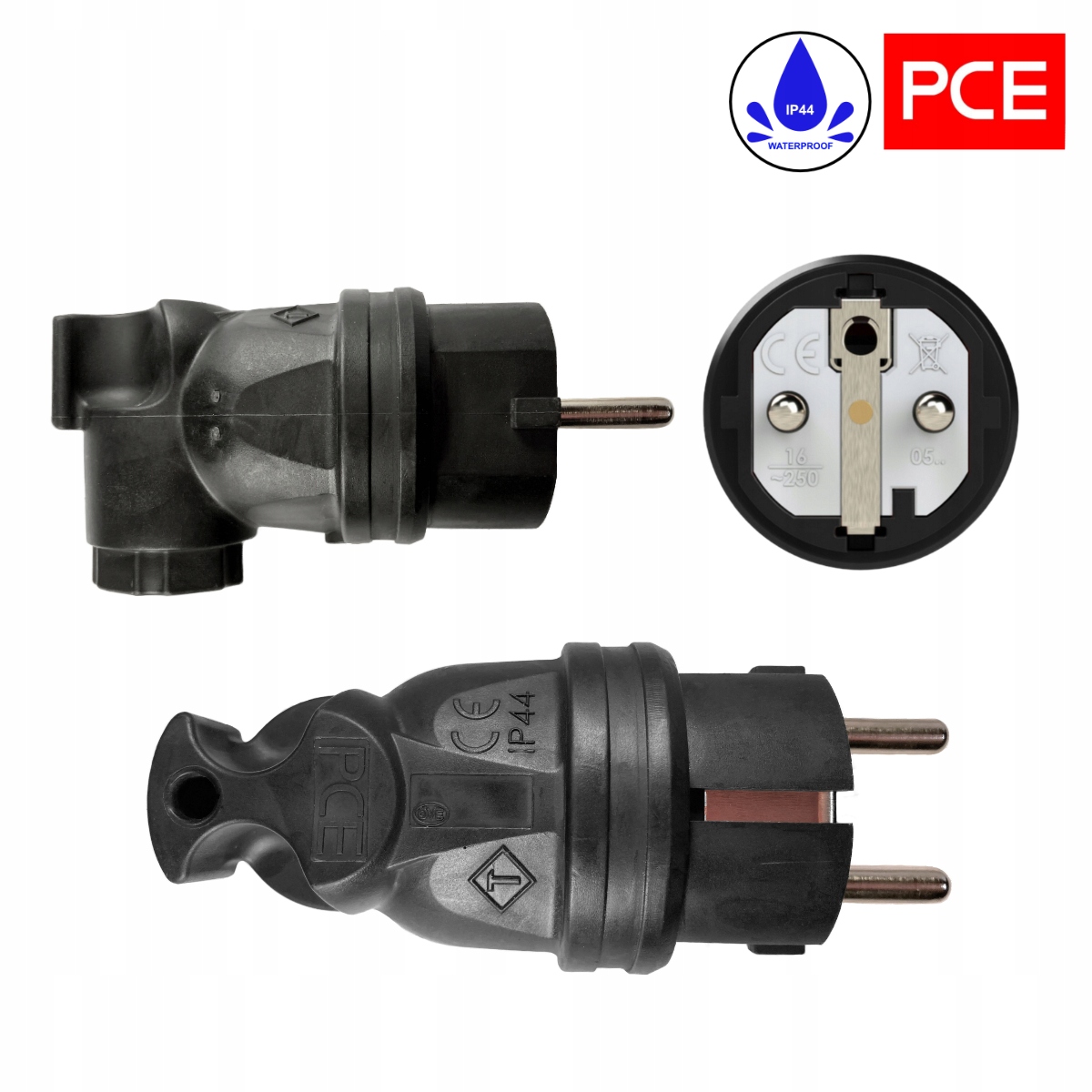Fiche coudée PCE UNI-Schuko, code 0521-ss, 10/16A 250V IP44 2P+T