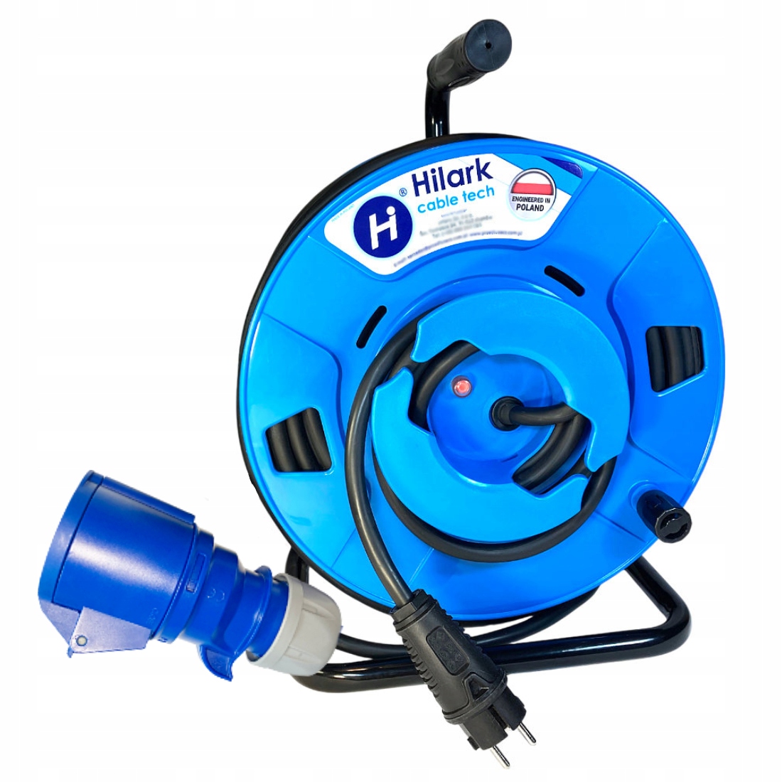 L’enrouleur ne gêne pas le travail, il est branché directement à la prise sur un connecteur de 2m, et on déroule le câble terminé par une prise CEE.