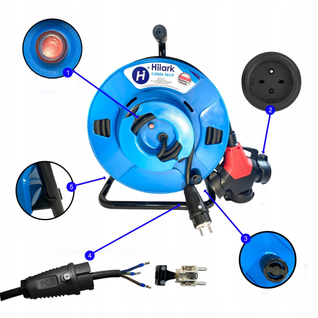 APPLICATION : Grâce à l’utilisation du câble Néoprène H07RN-F ainsi qu’un répartiteur de haute qualité et une fiche PCE avec un indice de protection IP54, la rallonge peut être utilisée en toute sécurité dans des endroits exposés aux huiles ou aux graisses, dans des conditions atmosphériques difficiles, dans des endroits secs et humides aussi bien à l’intérieur qu’à l’extérieur. L’enrouleur avec une poignée ergonomique et un cadre en acier stable permet un transport pratique de la rallonge n’importe où. La manivelle mobile permet un enroulement rapide et pratique du câble sur l’enrouleur, et le frein empêche le déroulement involontaire du câble. Il convient parfaitement pour l’éclairage de secours, l’outillage électroportatif tel que perceuses, scies circulaires, moteurs électriques, soudeuses, nettoyeurs haute pression ; pour les travaux de chantier et de rénovation, l’atelier, les mines, les cuisines, les plaques chauffantes. Ainsi que pour d’autres applications industrielles, dans les exploitations agricoles, pour l’alimentation sécurisée de divers types d’événements (pour équipements scéniques et audiovisuels). Le répartiteur permet la connexion simultanée de 3 appareils garantissant un fonctionnement sûr.