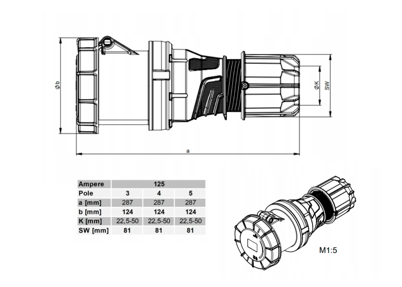- Caoutchouc type Néoprène, indice de protection IP 67, prises de marque PCE – démontables à usage multiple non surmoulées, 125A