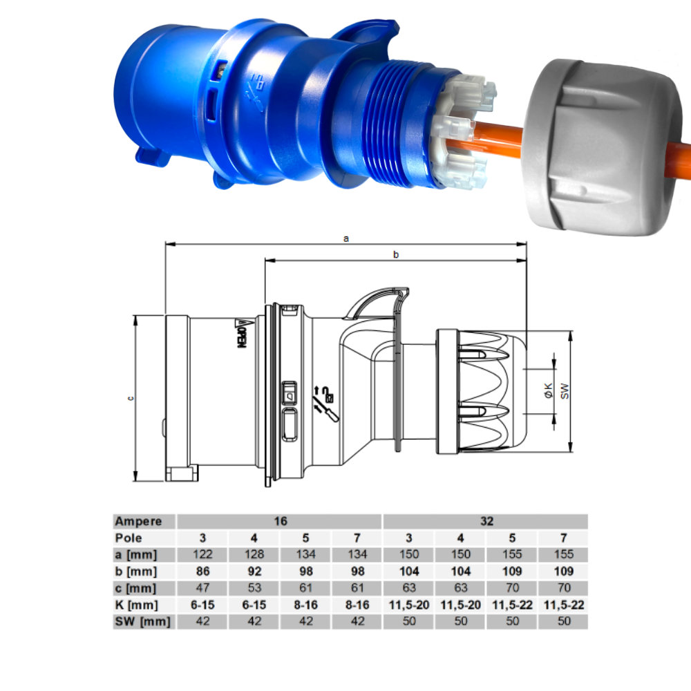 Rallonge triphasée CEE en polyuréthane H07BQ-F 3×2,5 2m Orange haute visibilité