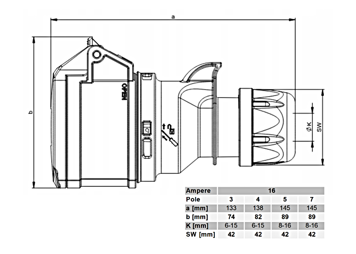 - Indice de protection IP 44, prises de marque PCE – démontables à vis non surmoulées, 16A