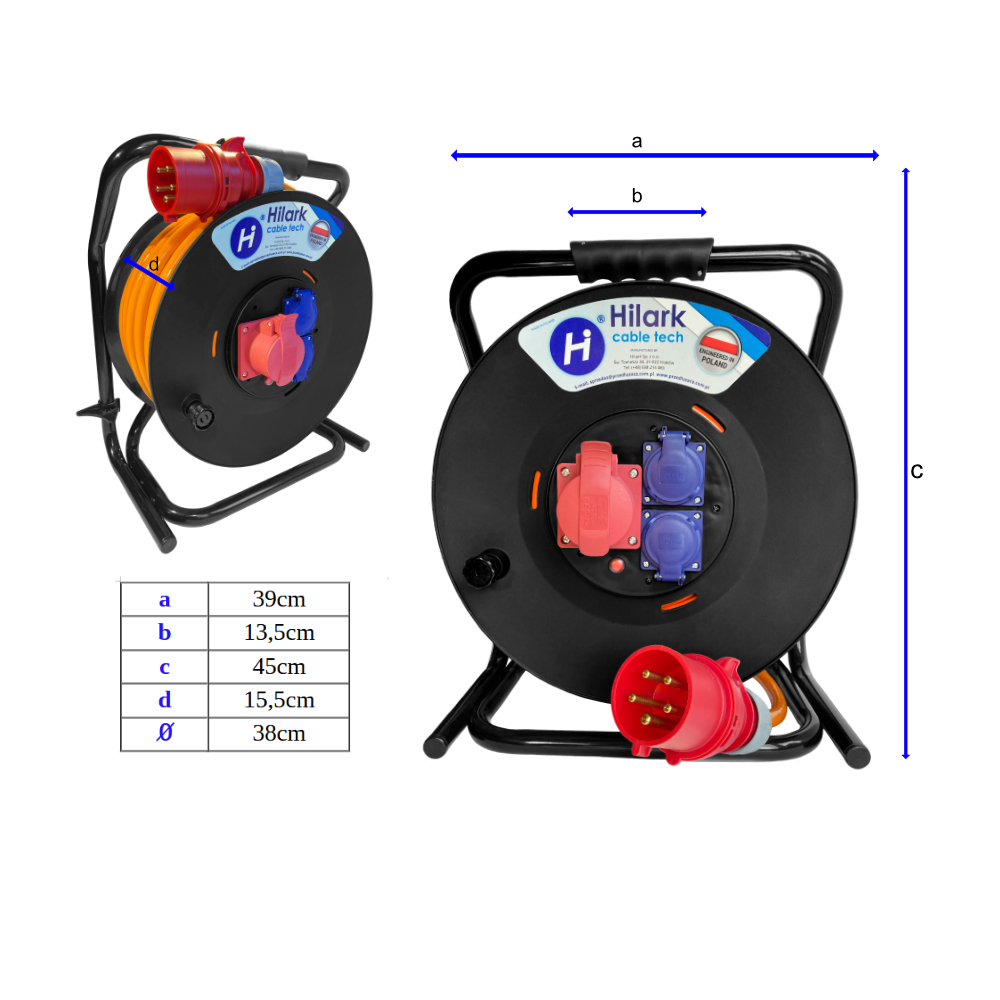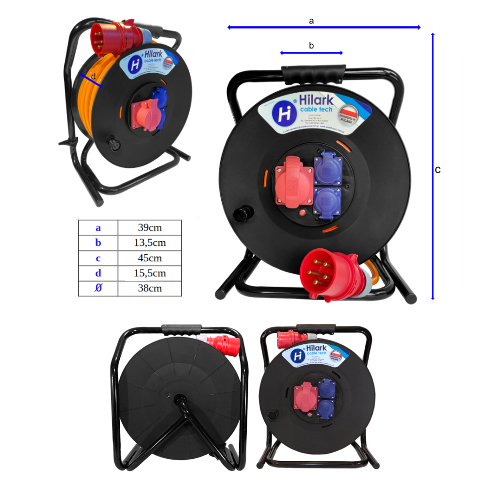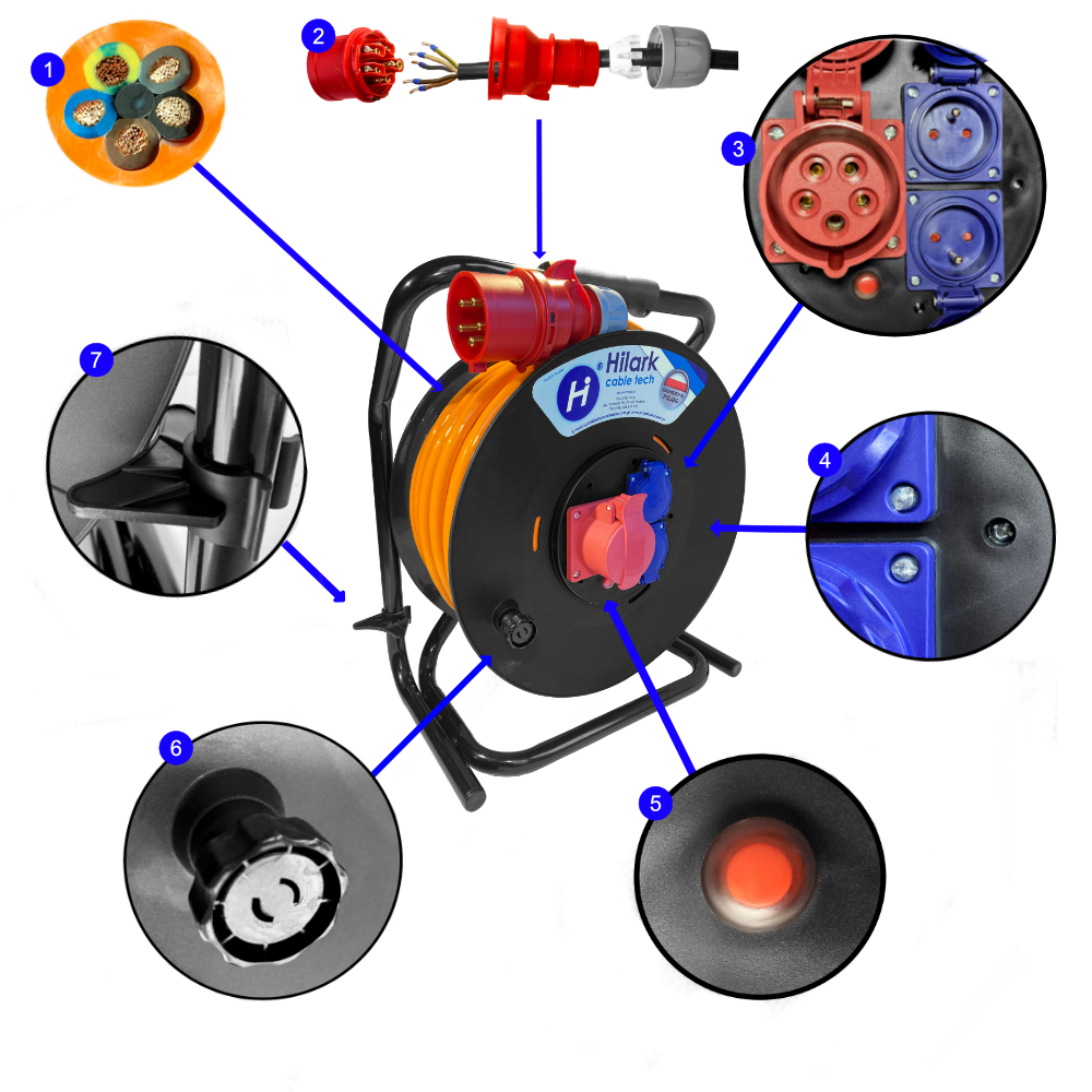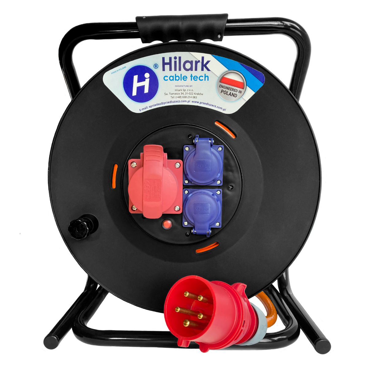 Rallonge de chantier Hilark la meilleure du marché, enrouleur avec prises 1x32A 5P 400V+ 2x16A 2P+T 230V ; avec fiche 32A 5P IP44 – le câble en polyuréthane est extrêmement résistant aux conditions atmosphériques variables et aux dommages mécaniques