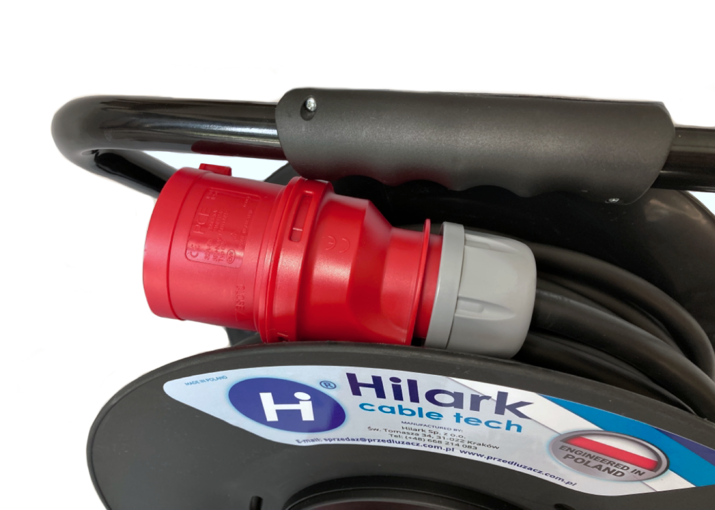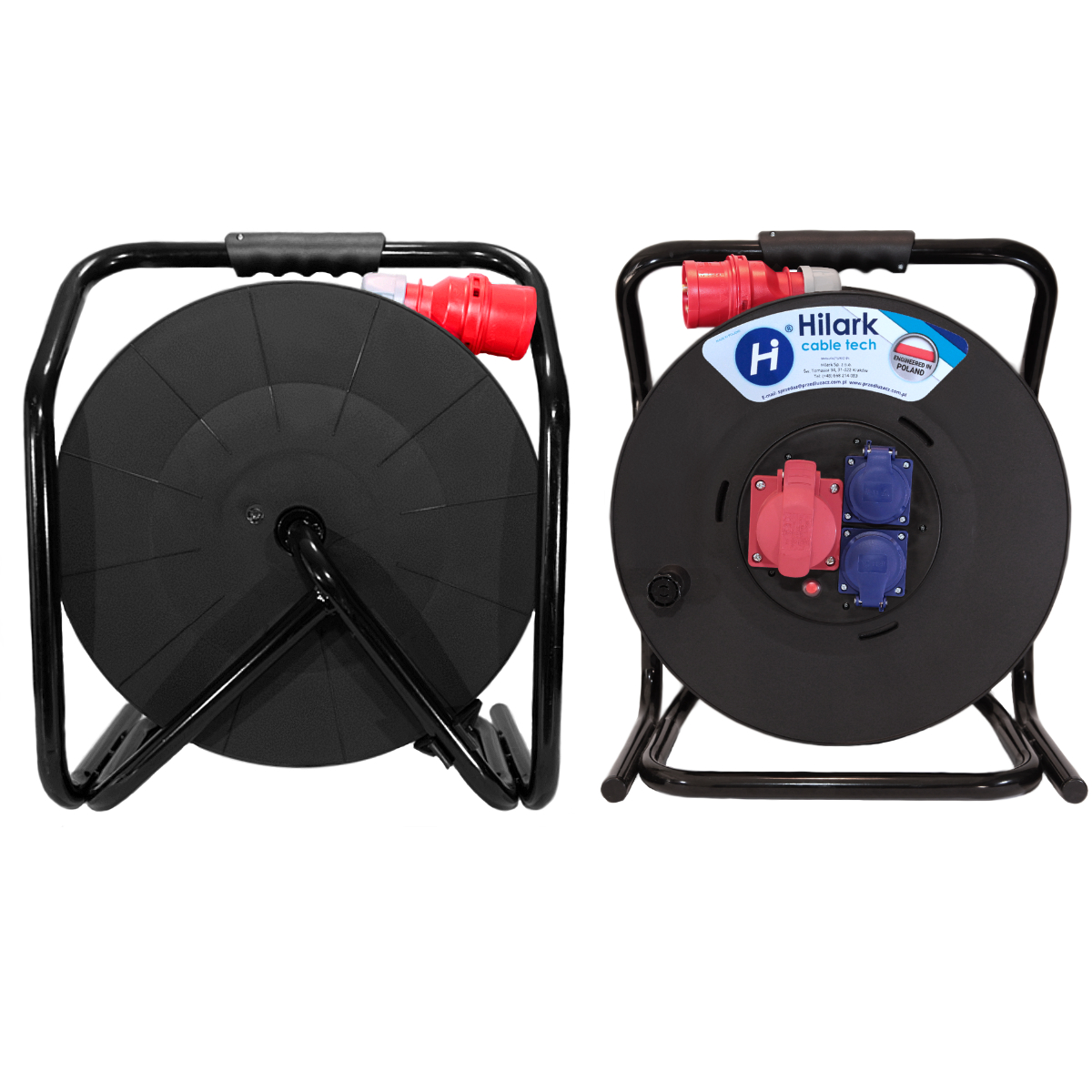 Rallonge triphasée CEE sur enrouleur avec prises 16A 5P 400V+ 2*16A 2P+Z 230V