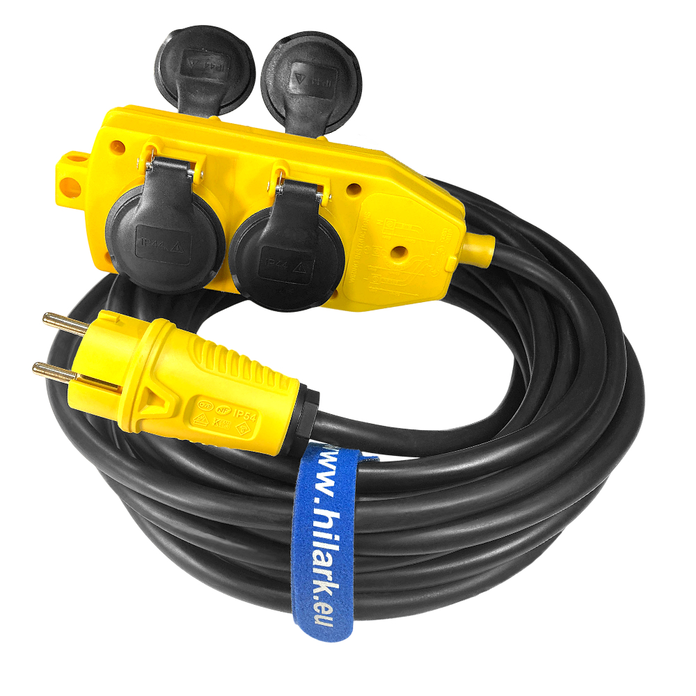 Rallonge électrique sur câble en caoutchouc souple, garantira un fonctionnement sécurisé dans des endroits humides et mouillés ; convient également parfaitement à une utilisation en extérieur ; dans des zones pouvant subir de légères dommages mécaniques. Le câble en caoutchouc combiné à une fiche PCE de haute qualité et un répartiteur à 4 prises, permet une utilisation sécurisée de la rallonge dans des conditions de travail difficiles. Grâce à l’utilisation de 4 prises avec un indice de protection IP44, il est possible de distribuer la tension et de connecter simultanément plusieurs appareils à une seule source d’alimentation (en tenant compte de la charge admissible) ainsi qu’un fonctionnement sécurisé des appareils dans des endroits humides. Le répartiteur et la fiche jaunes assureront une meilleure visibilité de la rallonge, augmentant ainsi la sécurité