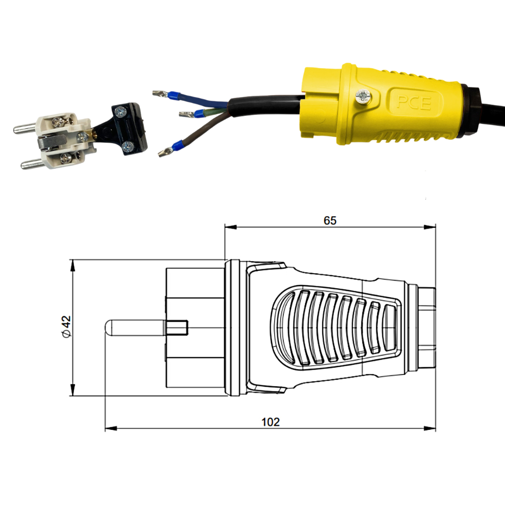 Fiche jaune PCE UNI-Schuko code 0521-ES, 16A 230V IP54