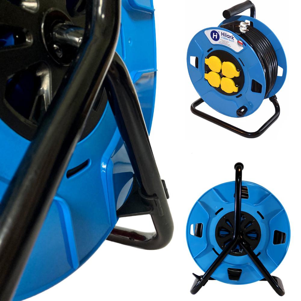 zamontowany z tyłu na stelażu hamulec zapobiega przed niepożądanym rozwinięciem przewodu przedłużacza z bębna