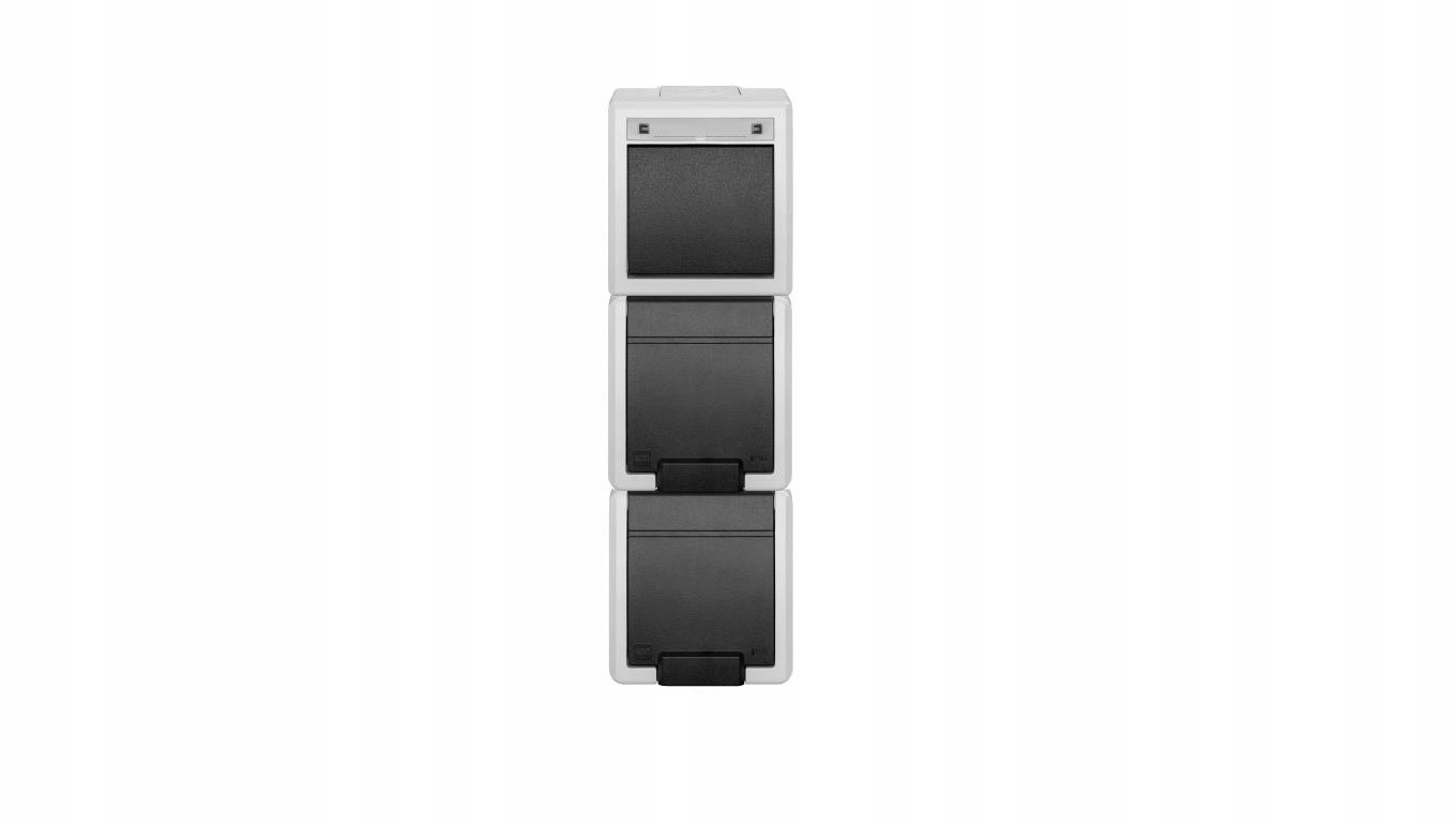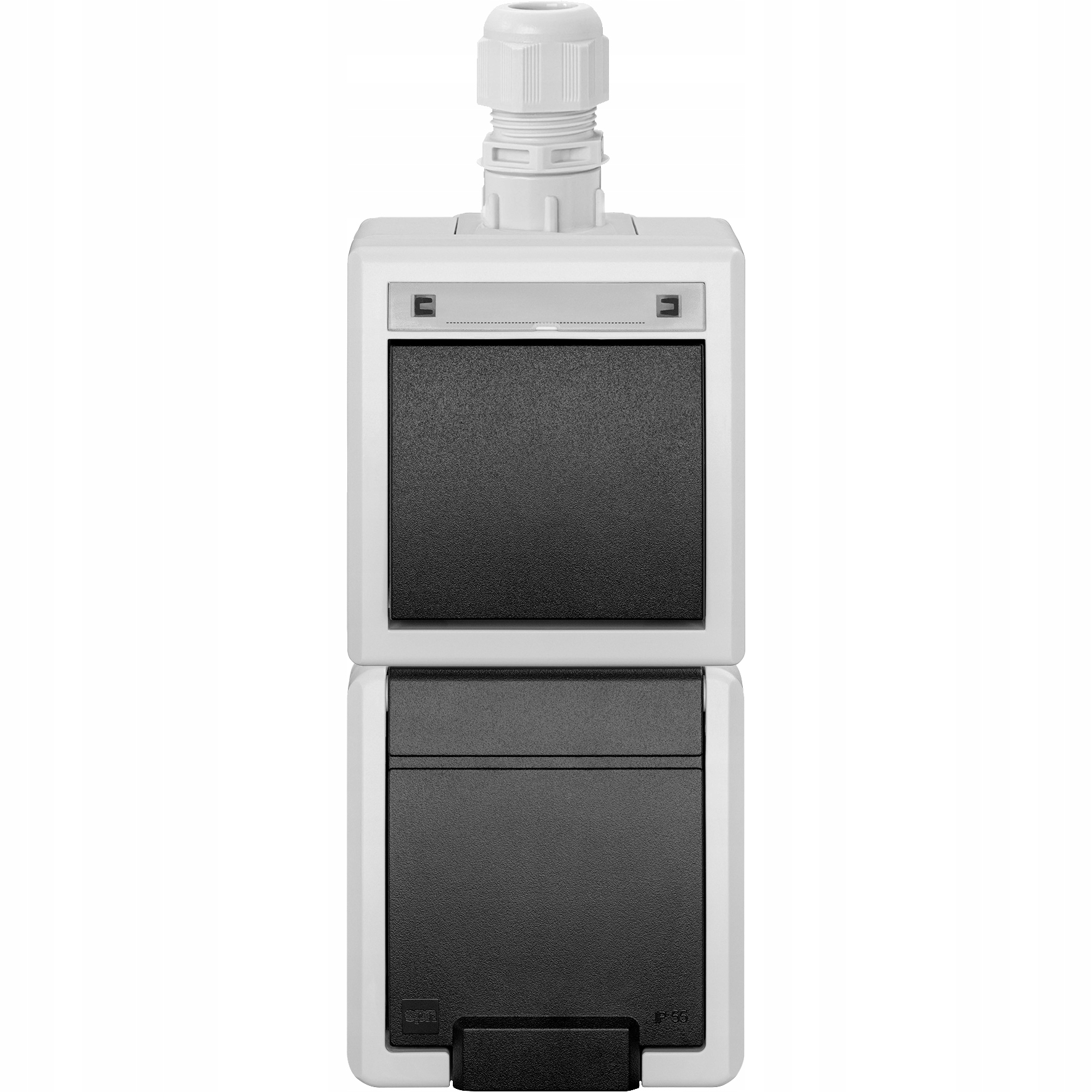 Ensemble en saillie vertical AQUANT™ 2K composé d’une prise étanche avec commutateur d’escalier, garantissant une haute étanchéité et une résistance à l’eau et à la poussière grâce à l’étanchéité innovante 2K et à la classe de protection IP65.